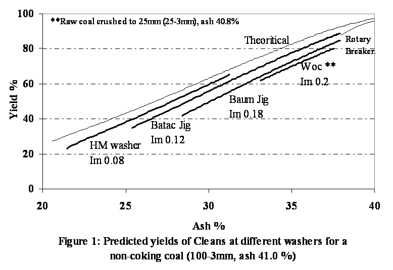 It is interesting to note that use of HM washer in either level II or level III has an achievable maximum limit of ash content (<31%) in the washed coal. Although this washer is effective in producing low ash (<25%) cleans with better yield, it is not desirable to use this circuit for producing washed coal of ash beyond 30-31%, as a jig will be a much simpler unit to operate.