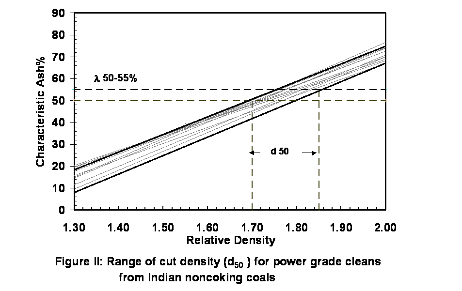 The concept of characteristic ash (l) which has been established previously as an optimum quality parameter for coking coal washing may be applied to select the specific gravity of cut in power coal beneficiation and to predict the combustion quality improvement thereby. The characteristic ash content (precisely, the elementary ash of the desired specific gravity fraction in F/S analysis) is one of the inherent properties of coal and washing a coal at a specific gravity determined from specified l value will minimize the presence of particles having ash values beyond this limit. From the detailed studies made by CFRI on Indian non-coking coals and their behaviour to ignition/combustion, it is proposed that the level of washing should be limited to that density of cut at which the washed product is devoid of particles of ash higher than 50-55%. The ash vs. relative density lines (figure II) for the coal samples studied show a working range of 1.70 to 1.85 as cut density for washing these coals while restricting the maximum ash of the particles in the clean product to the limit of 50-55%.