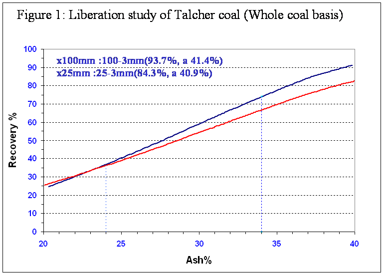 In this particular case, the coal was crushed to 100 and 25mm separately. As per requirement, +3mm fractions were only to be washed. It is seen that +3mm fractions in –100 and –25mm coal were 93.7 and 84.3%. Liberation characteristics are shown in Fig1.