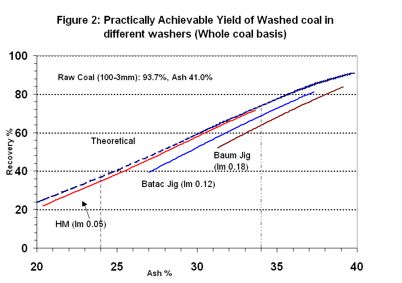Fig 3 also shows that Water only Cyclone (Im=0.2), can produce results slightly inferior to Baum Jig, and may not be able to reduce ash to below 34%.