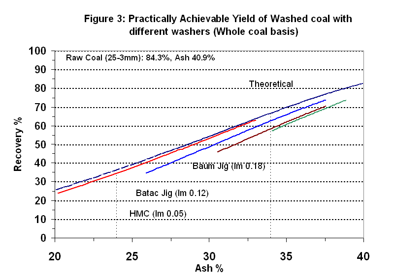 It is seen that with normal performance efficiency values ( Im = 0.18) of Baum jigs, the expected yield at 34% ash is about 70% (on whole coal basis) in case of 100-3mm coal and 64% for 25-3mm coal. It is also interesting to note that Baum jigs can reduce ash down to 30% only, due to inherent design parameters e.g. Sp. Gr. of cut can not be reduced to below 1.65.