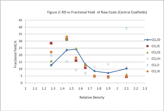 The above conclusion is very important from the point of view of coal preparation, where most of the effective processes depend on gravity washing like Jig, H.M. Bath and Cyclone, etc. Barrels and Spirals also depend on Gravity Techniques to a large extent. Thus, it is suggested here, for the first time, to optimize the quality of washed coal to be supplied to a specific type of boilers by its GCV. However, the actual yield of cleans will depend upon the washability characteristics of each individual coal. Figure 2 depicts the fractional yield between the lower and upper RDs. It may be pointed out that the relation is random and can vary from seam to seam, location to location and day to day production.