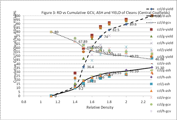 In the present case, the expected GCV, Ash and Yield of cumulative cleans are shown in Figure3. If we want to limit the minimum GCV of individual particles to about 3000 kcal/kg, the corresponding characteristic ash will become about 55% and RD of cut is predicted to be 1.875. The cumulative GCV and ash content of the theoretical cleans will be about 5200 kcal/kg and 30% respectively, with a cumulative yield of around 85%. The actual cumulative yield of cleans and their quality will depend upon the raw coal supplied from day to day and efficiency of washing.