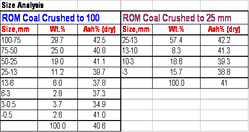 The above table shows the probable size analysis of raw coals when crushed to top sizes 100 and 25mm. As Sponge iron industries prefer to accept prepared coals of size 25-3mm, the production of –3mm (as high as 15.7%) in the case of feed crushed to 25mm is already a constraint. In the comparative case with –100mm coals its amount is hardly 6.1%. It will be worth studying, how much will be the production of –3mm size coal when the washed coal of size 100-3 mm is crushed to –3mm.