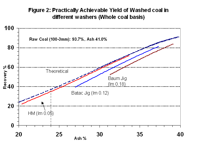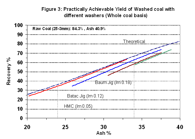 When the raw coal is crushed to 25mm, the practically achievable yields of washed coal from different choice of washers are given in Fig 3. It is seen that